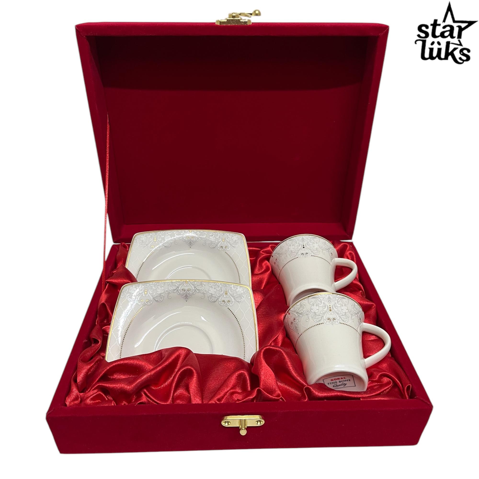 2’li 4 Parça Güral Porselen Desenli Kahve Fincan Takımı Kırmızı Kutusu ile Birlikte