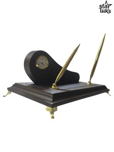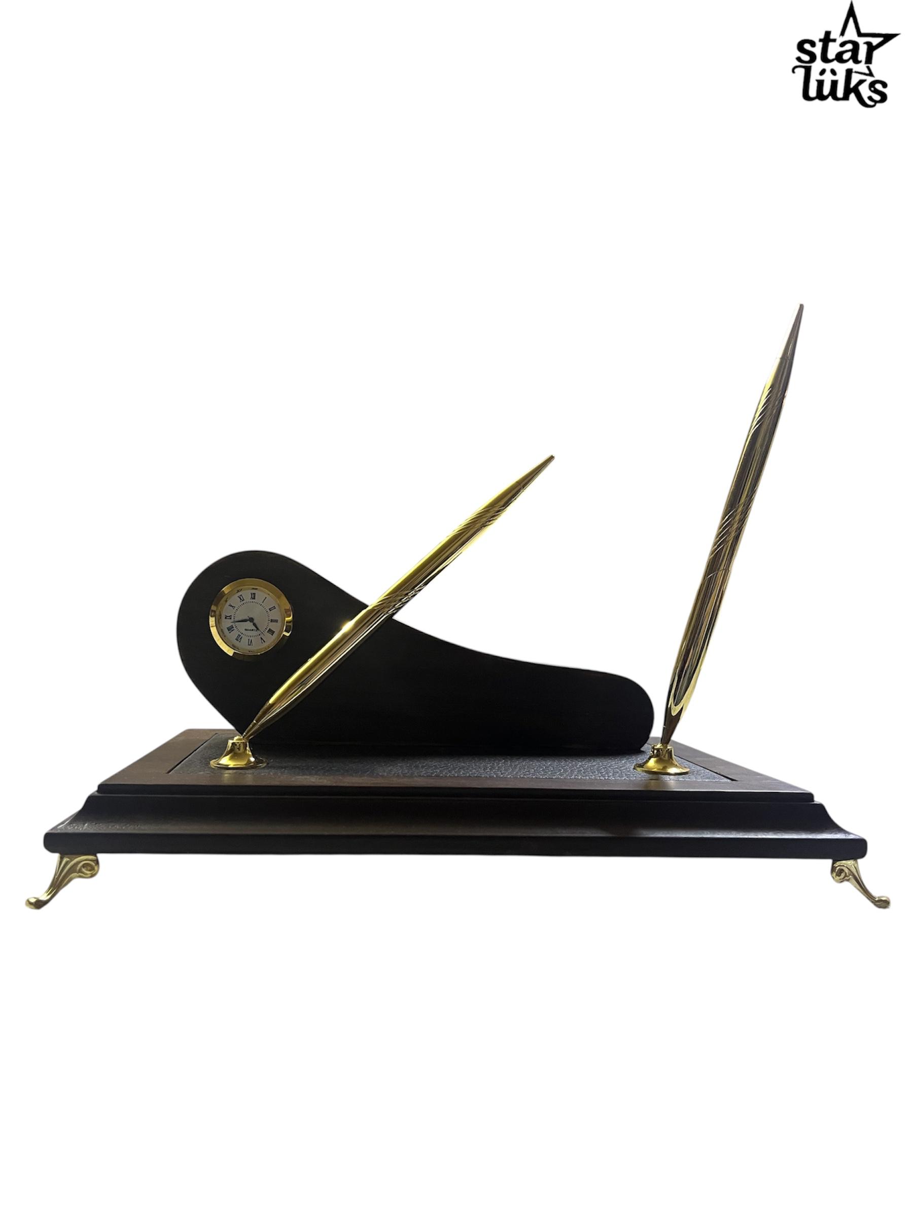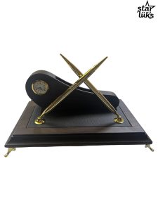 Bu masa isimliği, şık ve zarif bir tasarıma sahip bir ofis veya çalışma masası dekorudur. Ahşap bir taban üzerine oturtulmuş, deri kaplama detaylarıyla zenginleştirilmiş bir yapıya sahiptir. Üzerinde küçük, yuvarlak bir saat bulunur ve saat, altın rengi çerçeve ile klasik bir görünüm sunar. Ayrıca, iki adet altın rengi kalem, zarif bir açıyla tabana sabitlenmiştir ve hem dekoratif hem de işlevsel bir kullanım sunar. Alt kısımda yer alan altın rengi ayak detayları, ürüne vintage bir hava katar. Bu aksesuar, masa düzenini tamamlamak ve profesyonel bir atmosfer yaratmak için ideal bir seçenektir.