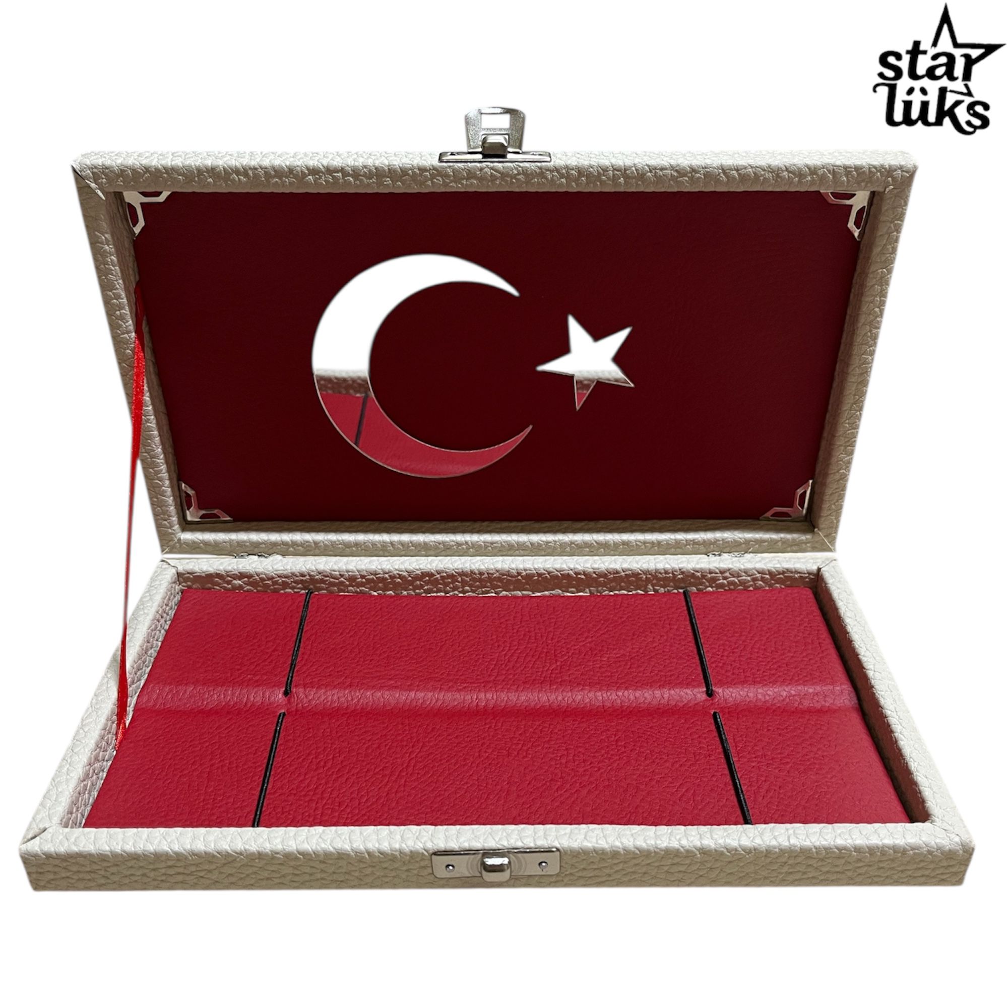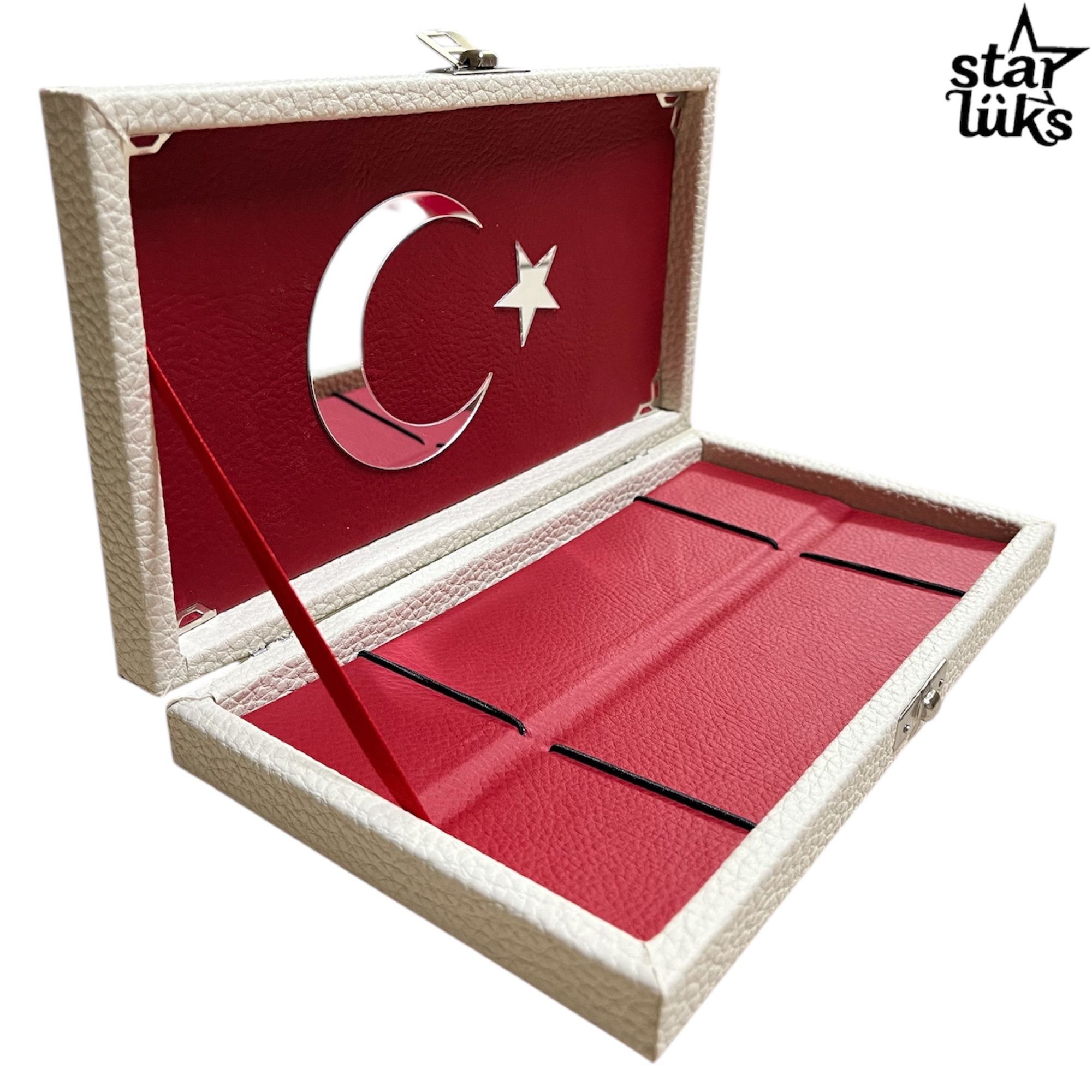 - Ay ve yıldız desenleriyle süslenmiş, Türk bayrağı motiflerine sahip ikili tasarım, şıklığı ve milliyet duygusunu bir arada sunar.